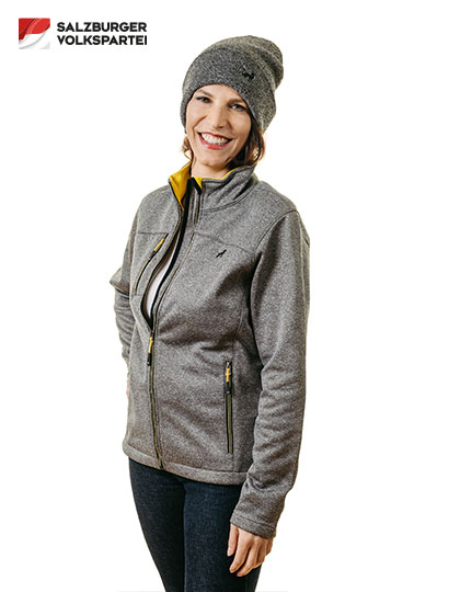 Diese elegante Damen Softshelljacke verbindet sportliche Funktion mit einem klaren Statement. Auf der linken Brust befindet sich die hochwertig gestickte Löwin in Schwarz, das persönliche Symbol von Landeshauptfrau Karoline Edtstadler. Die Löwin steht für Stärke, Verantwortung und Haltung – Werte, die Salzburg prägen.